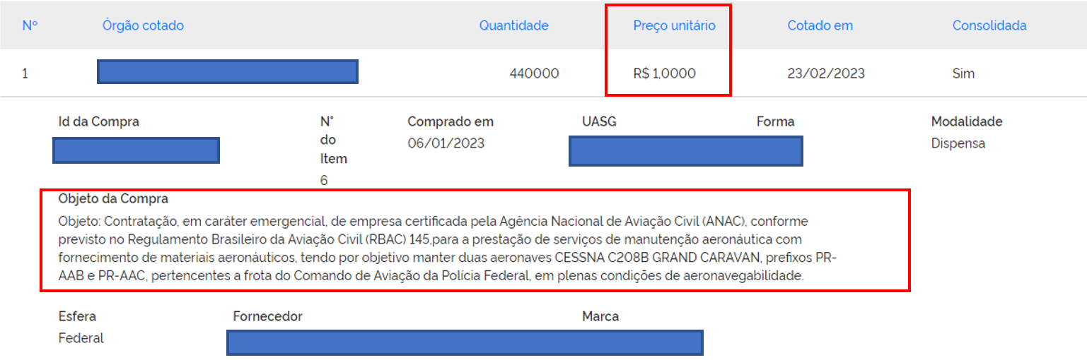 O uso indevido de códigos genéricos ou em dissonância com o objeto real da contratação pode resultar em eventuais prejuízos diretos e indiretos à Administração Pública, causando distorção dos valores das cotações, das médias e medianas apresentadas no painel de preços e no sistema de Pesquisa de preços. Como exemplo, utilizou-se o código genérico n. 116165 – Avião Nome: Avião.
