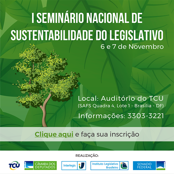 As áreas de gestão do TCU, Câmara dos Deputados e Senado Federal, em parceria com o Interlegis e o Instituto Legislativo Brasileiro, estão organizando o I Seminário Nacional de Sustentabilidade do Legislativo, a ser realizado nos dias 6/11/2018 (terça-feira), das 9 às 18 horas, e 7/11/2018 (quarta-feira), das 9 às 12:15, com as seguintes características: