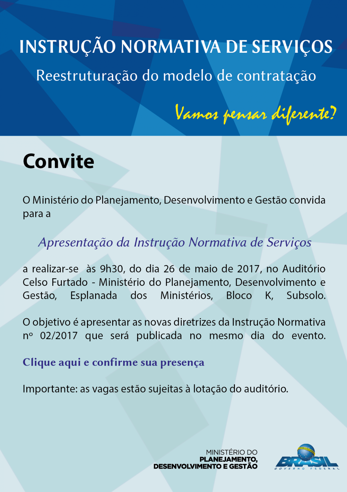 Lançamento da instrução normativa de serviços, a realizar-se às 9h30, do dia 26 de maio de 2017.