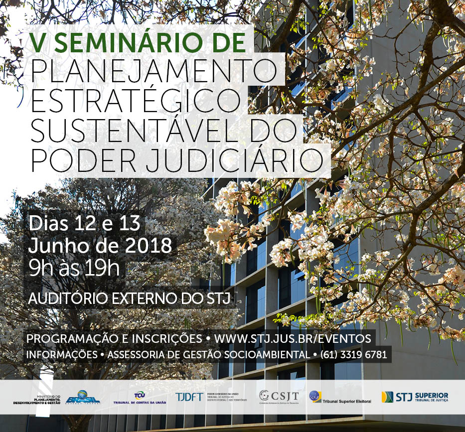 O V Seminário de Planejamento Estratégico Sustentável do Poder Judiciário acontecerá dias 12 e 13 de junho no Auditório do Superior Tribunal de Justiça, em Brasília, tendo como tema a sustentabilidade no contexto do planejamento estratégico das instituições públicas do Poder Judiciário e demais poderes da União.