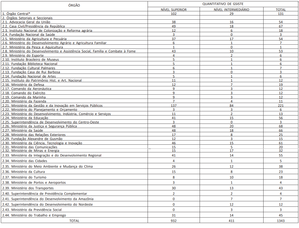 QUADRO DEMONSTRATIVO DAS GSISTE DISTRIBUÍDAS AOS ÓRGÃOS CENTRAL, SETORIAIS E SECCIONAIS DO SISTEMA DE SERVIÇOS GERAIS - SISG