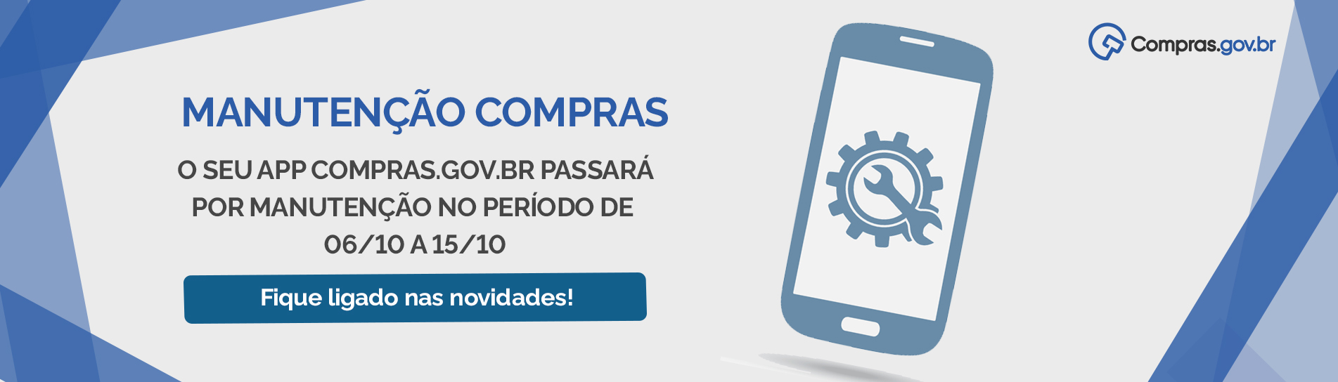 O APP Compras.gov.br ficará ainda melhor, e para que as evoluções aconteçam o aplicativo ficará indisponível a partir do dia 06/10/2021, voltando a funcionar em 15/10/2021. Mas não se preocupe, você conseguirá acessar e consultar as licitações e contratações que está participando por meio do nosso Portal de Compras.