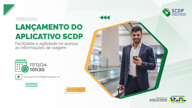A partir de agora, servidores públicos federais podem acompanhar, passo a passo, o processo de solicitação de suas viagens a serviço. Com o lançamento do aplicativo SCDP, Sistema de Concessão de Diárias e Passagens, é possível também verificar o status de viagens já realizadas. A inovação, promovida pela Secretaria de Gestão e Inovação do Ministério da Gestão e da Inovação em Serviços Públicos (Seges/MGI), reforça a transparência e a agilidade no processo de afastamento do servidor a serviço da Administração Pública Federal. O aplicativo SCDP estará disponível, em breve, para uso em dispositivos iOS e Android.