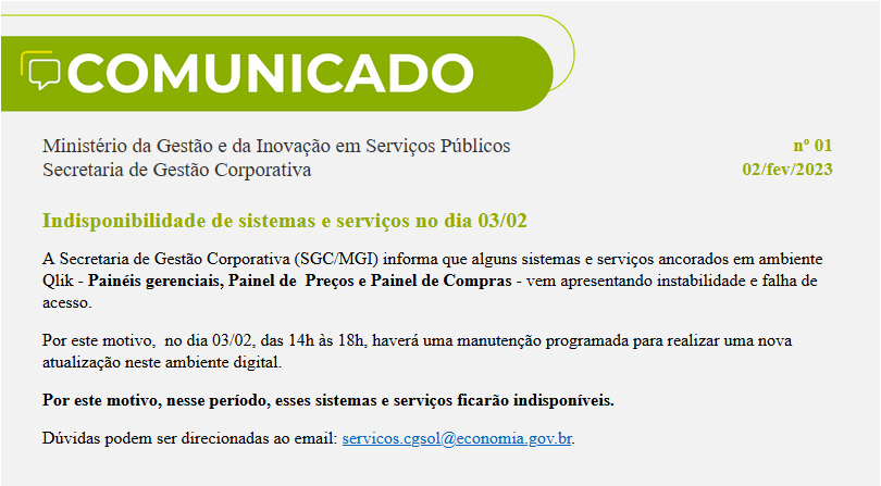 Indisponibilidade dos painéis de Compras e Preços no dia 03 de fevereiro de 2023