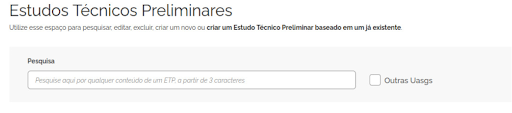 Para realizar a pesquisa, o usuário poderá selecionar, no canto direito, a opção “Outras Uasgs” para visualizar o conteúdo de ETPs de UASGs que utilizam o sistema.