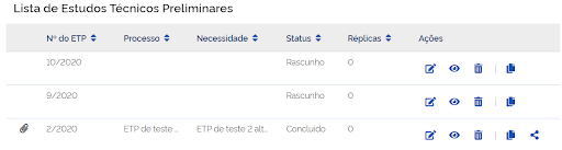 No resultado da pesquisa , na coluna “Ações”, é possível visualizar e replicar o ETP já compartilhado.