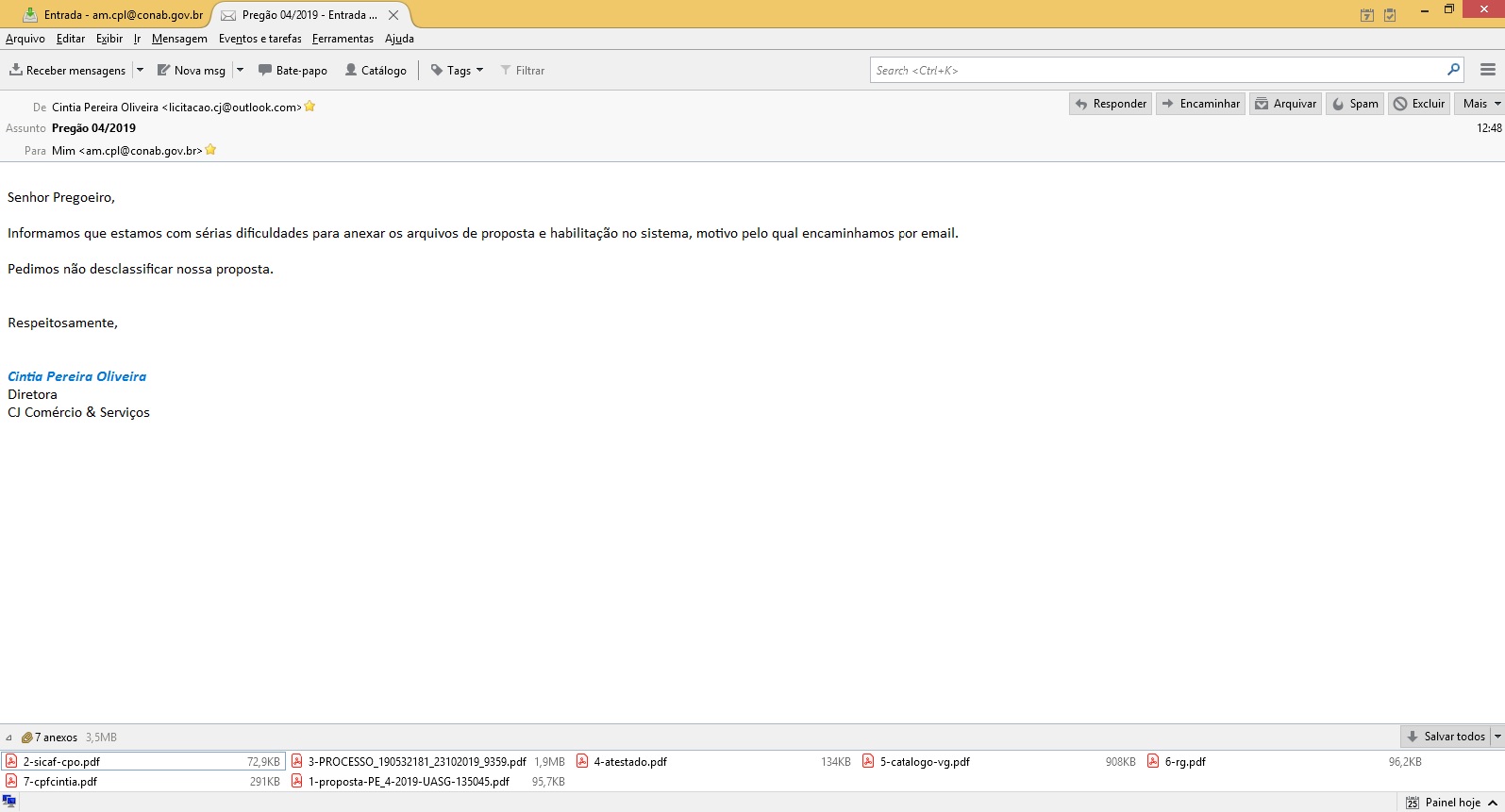 Edital de Pregão Eletrônico Envio de Documento Complementar - Cintia Conab/Sureg-AM SRP nº 04/2019