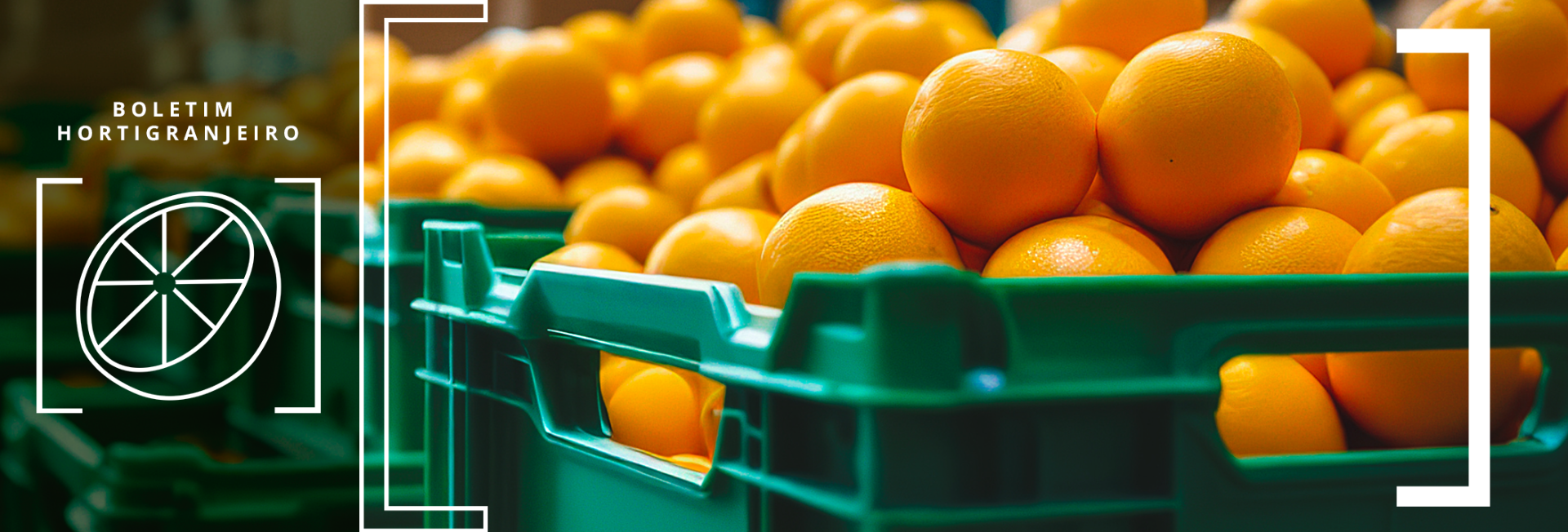 Imagem de laranjas em uma caixa verde. Texto: 11º Boletim Hortigranjeiro de 2025