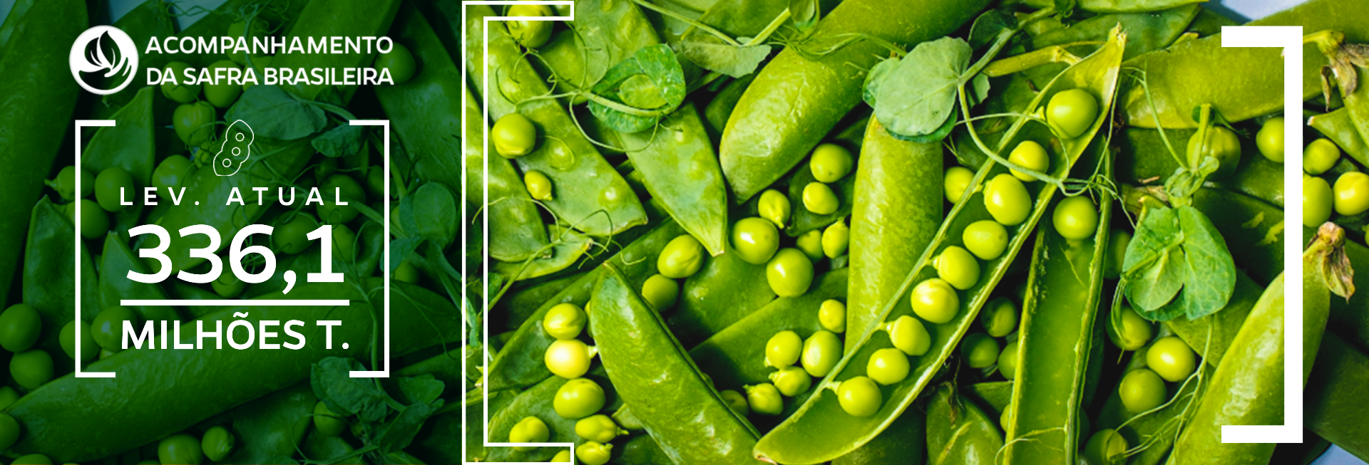 Imagem de vagem e grãos de feijão com estimativa da produção de grãos de 336,1 milhões de toneladas na safra 2024/25