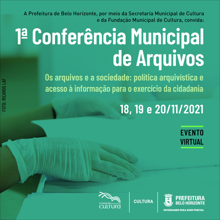A Secretaria Municipal de Cultura e a Fundação Municipal de Cultura promovem de 18 a 20 de novembro a primeira edição da Conferência Municipal de Arquivos. O evento, realizado pelo Arquivo Público da Cidade de Belo Horizonte (APCBH), tem como proposta discutir com a sociedade o Plano Municipal de Arquivos (PMA), que orienta as ações do poder público para o planejamento das políticas direcionadas ao setor. A programação será realizada em formato virtual, com atividades disponíveis em plataformas de acesso gratuito, e o tema será “Os Arquivos e a Sociedade: Política Arquivística e Acesso à Informação para o Exercício da Cidadania”.
