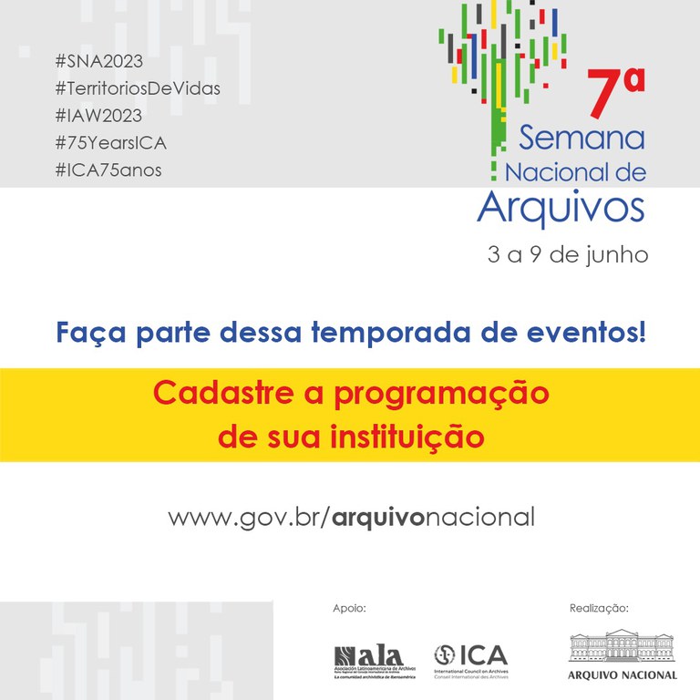 É, portanto, com entusiasmo que convidamos a comunidade arquivística brasileira, acadêmicas/os, profissionais de diferentes áreas, representantes de instituições e sociedade em geral para construirmos a nossa 7ª Semana Nacional de Arquivos! A gente se encontra entre os dias 3 e 9 de junho de 2023!