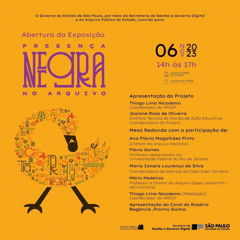 Participem do evento de abertura da exposição Presença Negra no Arquivo, na segunda-feira (06), à partir das 14 horas. Será no auditório do Arquivo Público do Estado de São Paulo, com transmissão pelo YouTube.