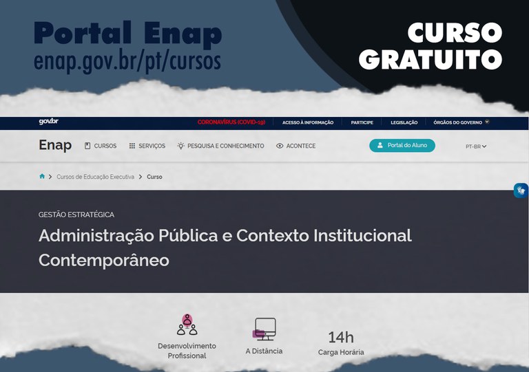 A Escola Nacional de Administração Pública (ENAP) está oferecendo gratuitamente o curso "Administração Pública e Contexto Institucional Contemporâneo", com 14 horas de aula transmitidas ao vivo.