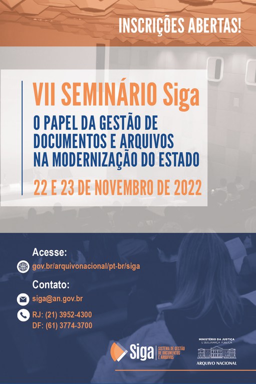 Estão abertas as inscrições para servidores dos órgãos integrantes do Sistema de Gestão de Documentos e Arquivos (Siga) participarem do VII Seminário do Siga. A temática desta edição é: “O papel da gestão de documentos e arquivos na modernização do Estado”.