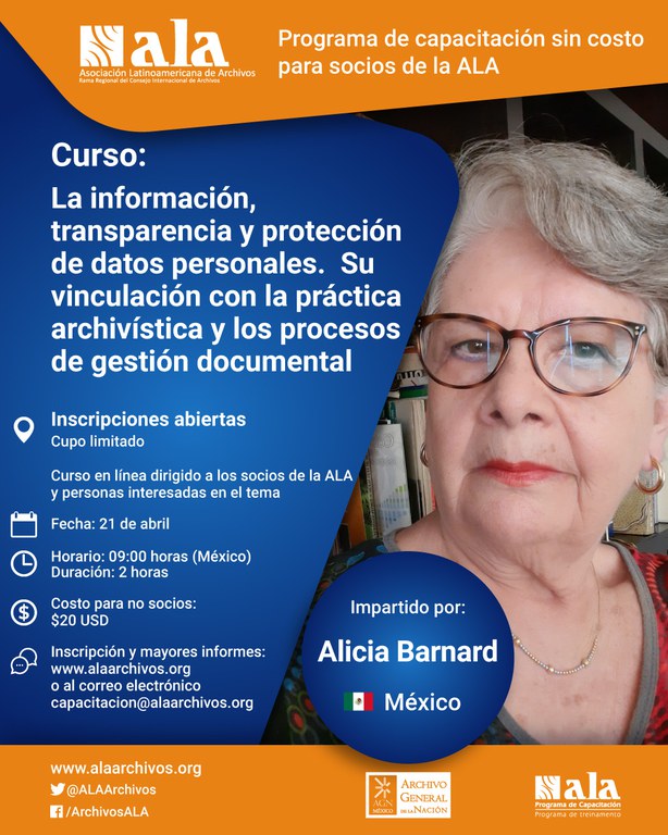 O objetivo do curso “Informação, transparência e proteção de dados pessoais. Sua ligação com a prática arquivística e processos de gestão de documentos”, a ser realizado pela Associação Latino-americana de Arquivos (ALA) no próximo dia 21 de abril, às 9h (horário do México), é apresentar aos participantes a identificação dos elementos que caracterizam os documentos de arquivo e o porquê da transparência da informação, dos dados pessoais e do acesso a informações precisarem ser considerados também nos processos de gestão documental.