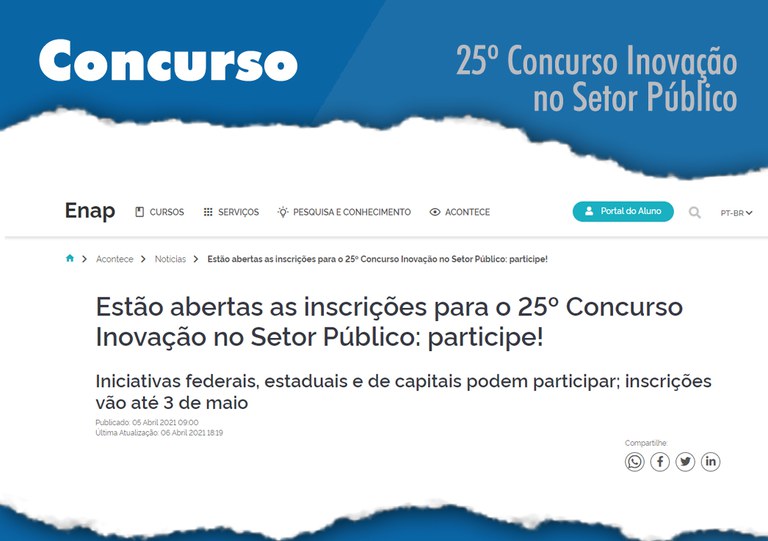 A Escola Nacional de Administração Pública (Enap) lançou no último dia 05 de abril a 25ª edição do Concurso Inovação no Setor Público – Modalidade de Práticas Inovadoras. As inscrições vão até o dia 03 de maio de 2021.