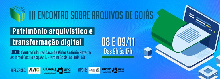 A Associação de Arquivologia do Estado de Goiás (AAG), em parceria com o Centro de Informação, Documentação e Arquivo da Universidade Federal de Goiás (Cidarq/UFG), apresentam o III Encontro sobre Arquivos de Goiás que se realizará nos dias 08 e 09 de novembro de 2022.