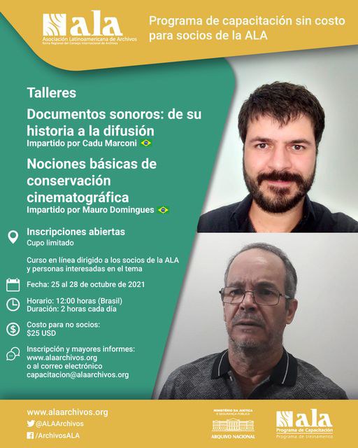 A Associação Latino-americana de Arquivos estará oferecendo, de 25 a 28 de outubro, duas oficinas que serão ministradas em português pelos técnicos do Arquivo Nacional: Cadu Marconi e Mauro Domingues.