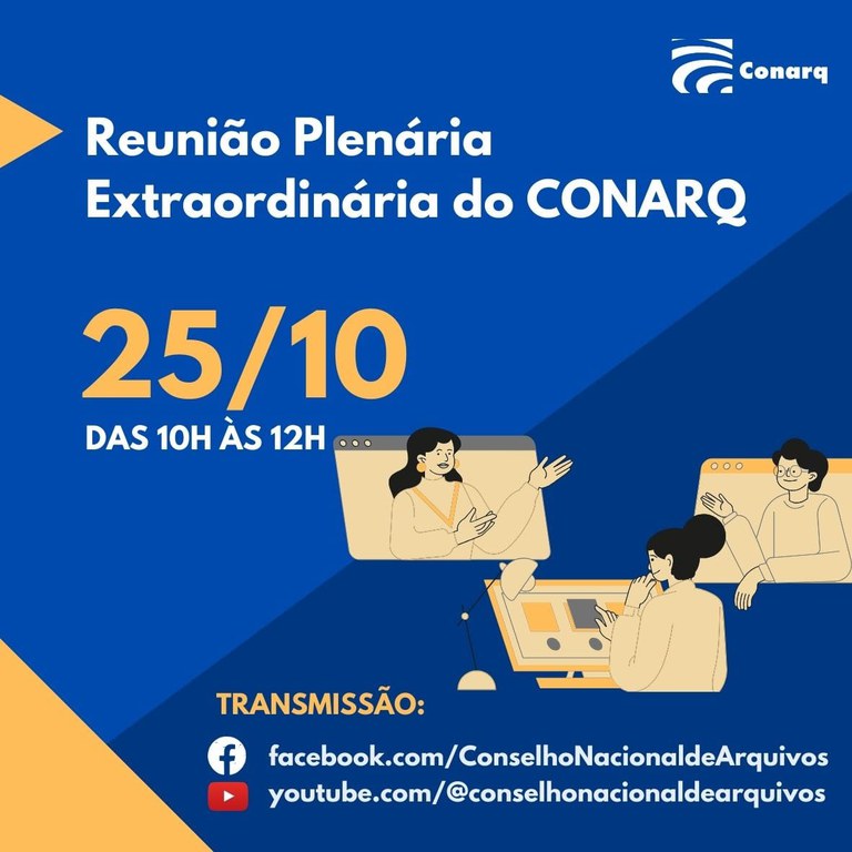 A reunião será transmitida de forma online nos seguintes canais: youtube.com@conselhonacionaldearquivos e facebook.com/ConselhoNacionaldeArquivos.