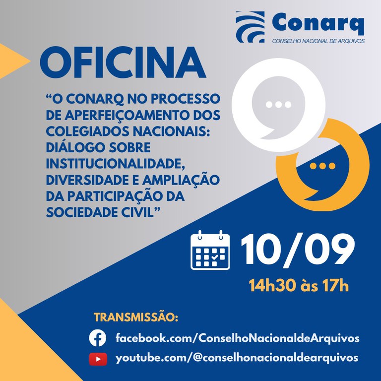 A Secretaria-Geral de Participação Social da Presidência da República realizará, no dia 10 de setembro de 2024, a oficina virtual intitulada "O Conarq no processo de aperfeiçoamento dos Colegiados Nacionais: diálogo sobre institucionalidade, diversidade e ampliação da participação da sociedade civil".