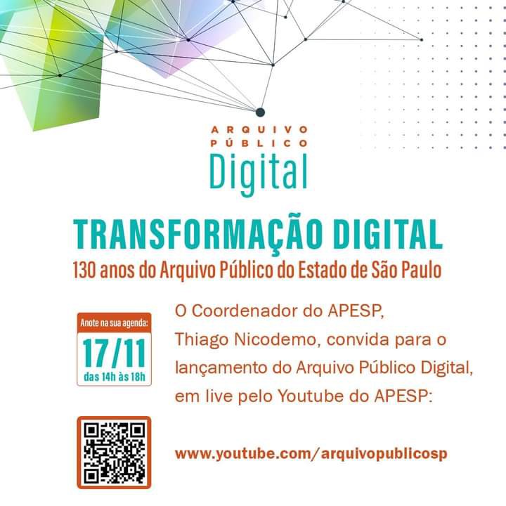 Mais informações em http://www.arquivoestado.sp.gov.br/web/eventos/ler/index/transformacao-digital-130-anos-do-arquivo-publico-do-estado-de-sao-paulo