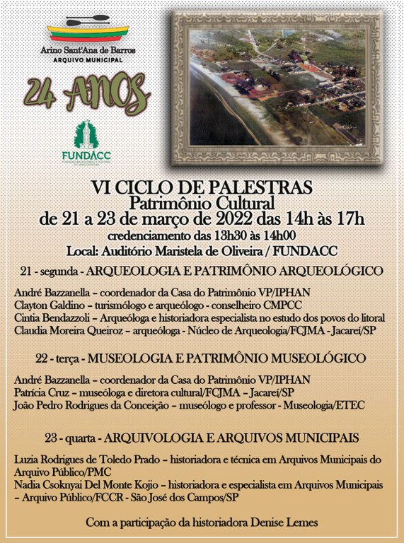 Em comemoração aos 24 anos do Arquivo Municipal de Caraguatatuba "Arino Sant'Ana de Barros" (São Paulo), será realizado o evento "VI Ciclo de Palestras - Patrimônio Cultural", nos dias 21 a 23 de março de 2022, das 14 às 17h, no auditório Maristela de Oliveira/FUNDACC.
