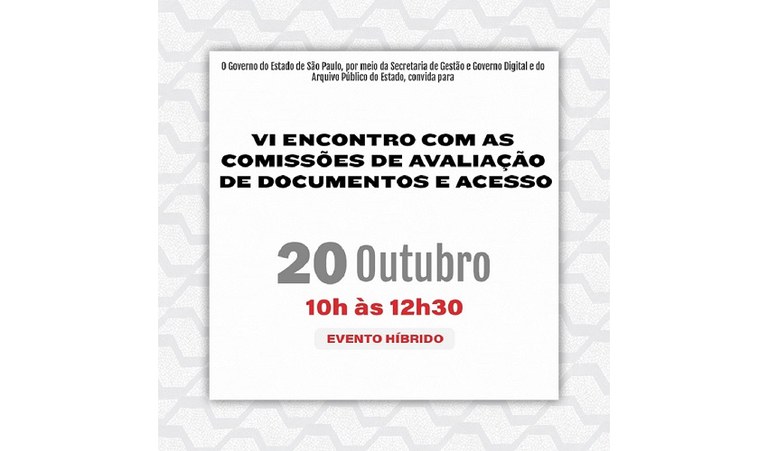 No dia 20 de outubro, o Arquivo Público do Estado realizará o VI Encontro com as Comissões de Avaliação e Acesso. Além das apresentações, o encontro marcará o lançamento do livro ‘Planos de Classificação e Tabelas de Temporalidade de Documentos para as Administrações Públicas Municipais’. O evento acontecerá das 10h00 às 12h30 no auditório do APESP, com transmissão simultânea pelo Youtube: youtube.com/arquivopublicosp. As inscrições para emissão de certificado devem ser feitas pelo site: www.arquivoestado.sp.gov.br/web/eventos