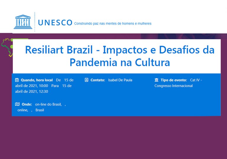 Para maiores informações, acesse o site da Unesco: https://events.unesco.org/event?id=3835283104&lang=3082 ou envie um e-mail para Isabel de Paula (i.paula@unesco.org).