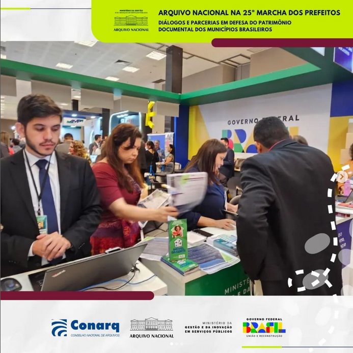 O Arquivo Nacional (AN), por meio do coordenador de Articulação Institucional, Fábio Costa, promoveu uma ação de incidência na 25ª Marcha a Brasília em Defesa dos Municípios, organizada pela Confederação Nacional dos Municípios (CNM), entre os dias 20 e 23 de maio de 2024, em Brasília. Mais conhecido como Marcha dos Prefeitos, o evento reuniu cerca de 11 mil pessoas no Centro Internacional de Convenções do Brasil (CICB), entre prefeitos, vice-prefeitos, secretários municipais, vereadores, assessores, além de outras autoridades de governos estaduais e federal.