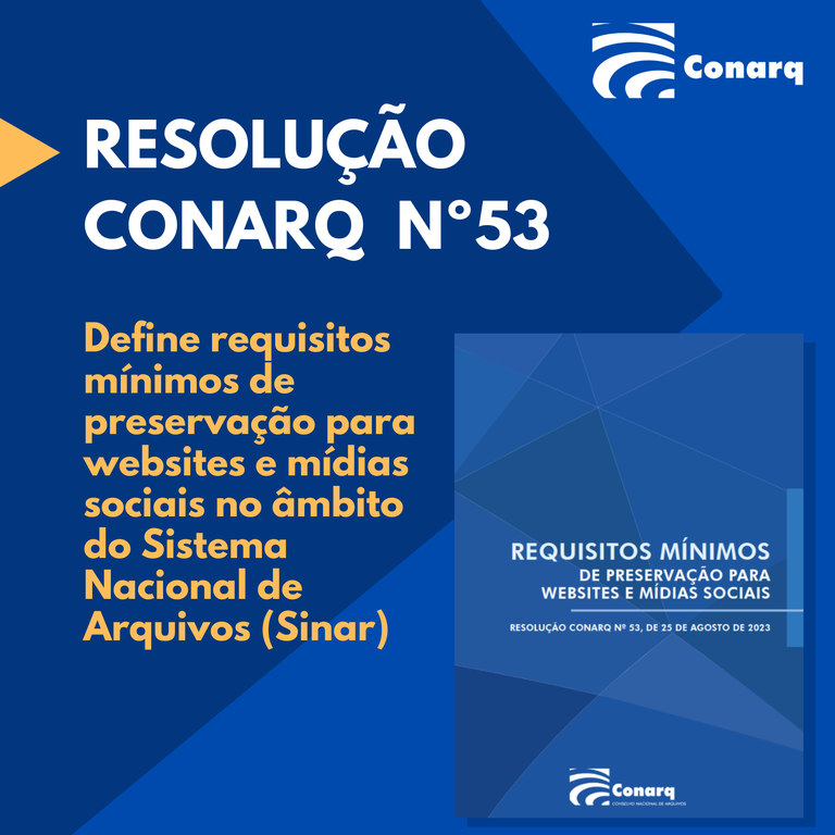 O Conarq publica sua Resolução nº 53, de 25 de agosto de 2023, definindo requisitos mínimos de preservação digital para websites e mídias sociais a serem adotados pelos integrantes do Sistema Nacional de Arquivos (Sinar). A finalidade do documento é apresentar as condições mínimas necessárias para alcançar o objetivo de preservar websites e mídias sociais em longo prazo, assumindo que são objetos digitais complexos de valor secundário. Ainda que sejam avaliados como de guarda permanente, eventualmente, assume-se a inviabilidade de preservar toda a web e, nesse sentido, o desenvolvimento dos requisitos apresentados considerou uma abordagem sistêmica que consiste em etapas que instrumentalizam a composição de um arquivo da web.