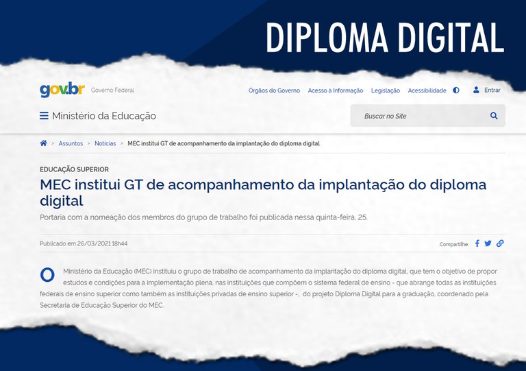Por meio da Portaria nº 122, de 23 de março de 2021, o Ministério da Educação (MEC) instituiu o grupo de trabalho de acompanhamento da implantação do diploma digital, que é aquele que é gerado, emitido e armazenado inteiramente por meio digital.