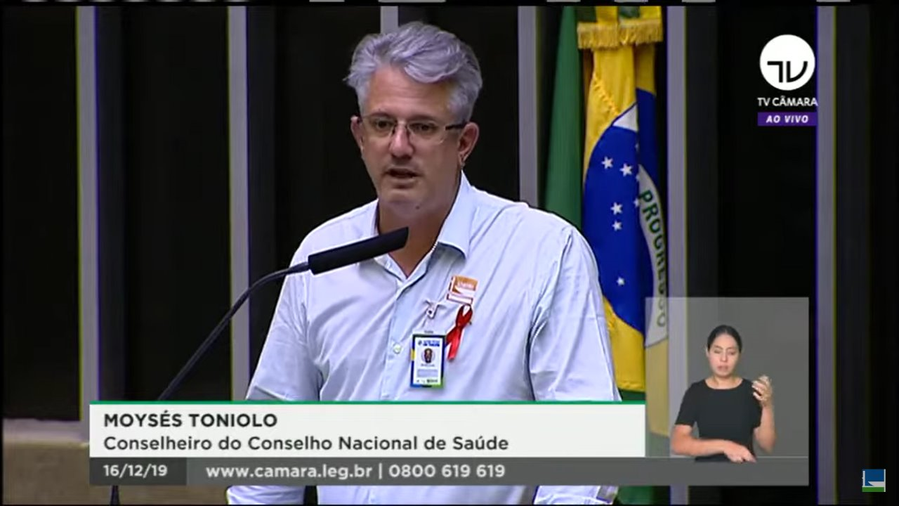 O conselheiro nacional de saúde, representante da Articulação Nacional de Luta Contra a Aids (Anaids), Moyses Toniolo, participou na última segunda (16/12), na Câmara dos Deputados, de uma sessão solene para marcar o Dia Mundial de Luta contra a Aids, celebrado no dia 1º de dezembro. A deputada Erika Kokay é a autora do pedido de realização da homenagem.