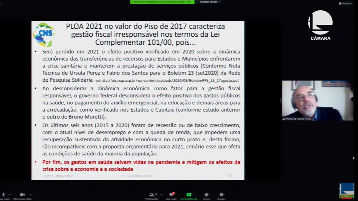 A comissão externa da Câmara dos Deputados que avalia as ações contra a Covid-19 realizou, nesta terça-feira (8/12), um debate sobre o Orçamento para a Saúde em 2021. O Conselho Nacional de Saúde (CNS) participou da reunião representado pelo economista e consultor técnico da Comissão de Orçamento e Finanças (Cofin), Francisco Funcia. Na ocasião, os debatedores evidenciaram que não há recursos para a vacinação contra a Covid-19 no próximo ano.