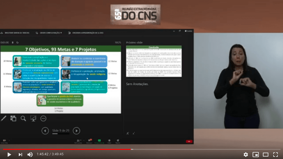 O plano foi contextualizado pelo coordenador de planejamento da subsecretaria de Planejamento e Orçamento (SPO) da secretaria executiva do Ministério da Saúde, Paulo Guilherme Ribeiro. “O documento foi enviado para o CNS seguindo as normas que regem esse envio e conta com 7 objetivos, 93 metas e 7 projetos”, explicou Paulo Ribeiro. Os objetivos estão ligados à atenção primária, prevenção e controle, atenção especializada, saúde indígena, medicamentos e insumos estratégicos, conhecimento científico, dentre outras áreas.