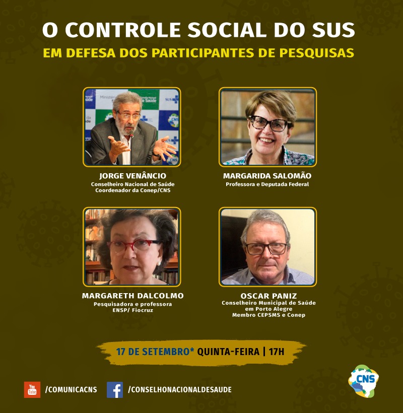 Com a participação da deputada federal Margarida Salomão, da pesquisadora da Fundação Oswaldo Cruz (Fiocruz) Margareth Dalcolmo e do membro do Comitê de Ética e Pesquisa (CEP) de Porto Alegre Oscar Paniz, a live vai abordar o Projeto de Lei nº 7.082, que pode reduzir os diretos dos pacientes de pesquisas e fragilizar a independência da Comissão Nacional de Ética em Pesquisa (Conep) do CNS.