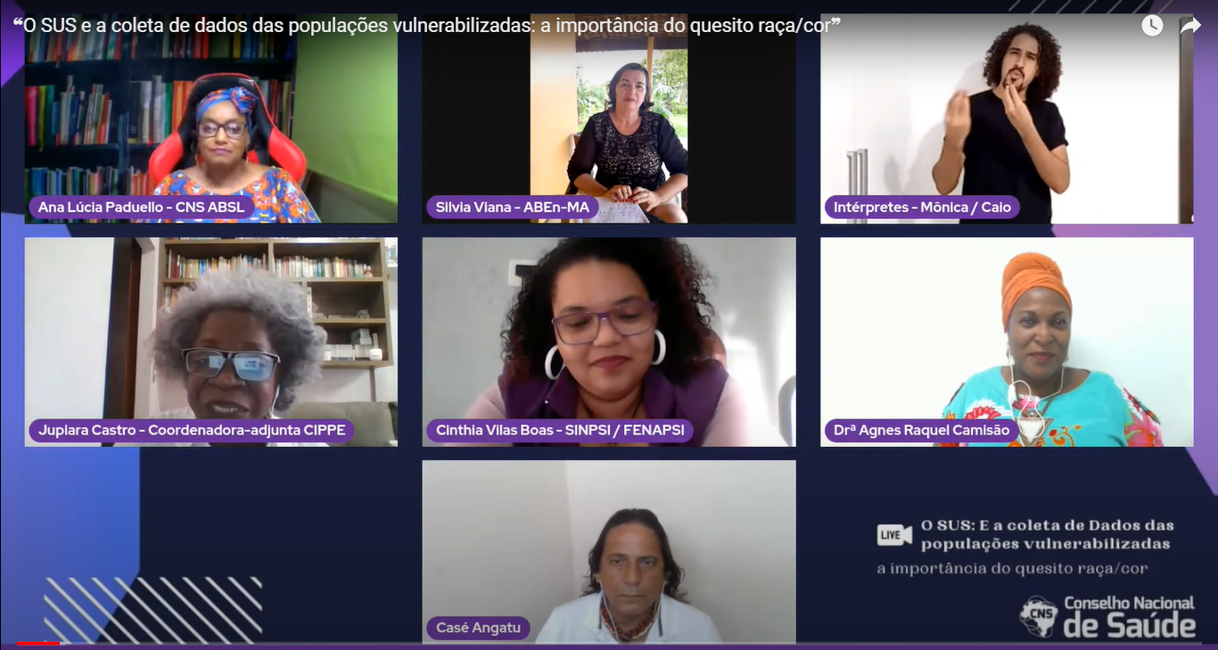 Na última terça (22/04), o Conselho Nacional de Saúde (CNS) deu continuidade ao ciclo de debates intitulado “Ocupação Preta: Rodas Virtuais sobre Equidade e Saúde”, que traz uma série de especialistas negros e indígenas para debaterem o Sistema Único de Saúde (SUS) e a coleta de dados das populações subalternizadas. O descuido com o quesito raça/cor vulnerabiliza ainda mais negros e indígenas no Brasil. O evento foi transmitido no Facebook e Youtube do CNS.