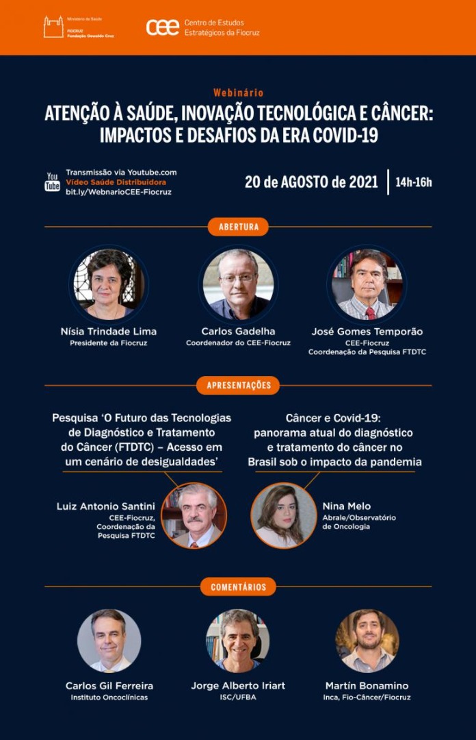 Essas e outras questões estarão em pauta no webinário Atenção à Saúde, Inovação Tecnológica e Câncer: Impactos e Desafios da Era Covid-19, que será realizado pelo Centro de Estudos Estratégicos da Fiocruz (CEE-Fiocruz), no dia 20 de agosto de 2021, das 14h às 16h. O evento contará na mesa de abertura com a presença da presidente da Fiocruz, Nísia Trindade Lima, do diretor do CEE-Fiocruz, Carlos Gadelha, e do ex-ministro da Saúde e pesquisador do Centro, José Gomes Temporão.