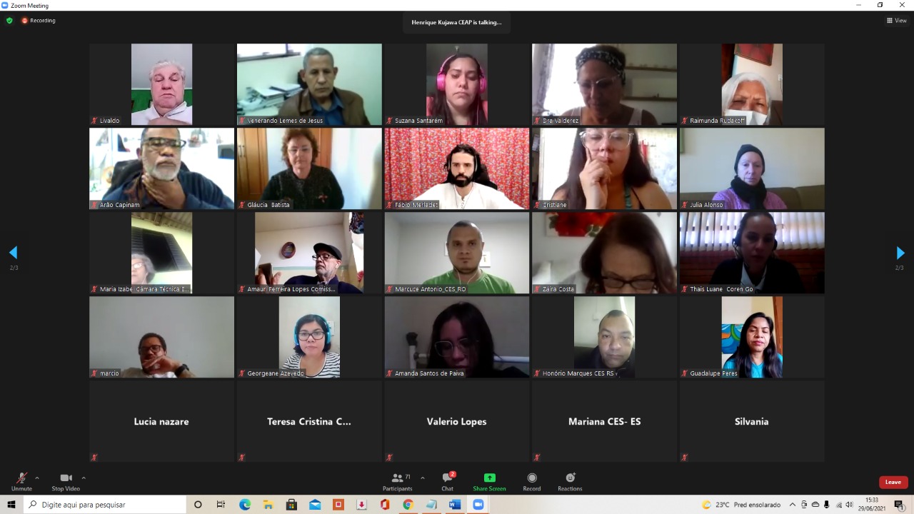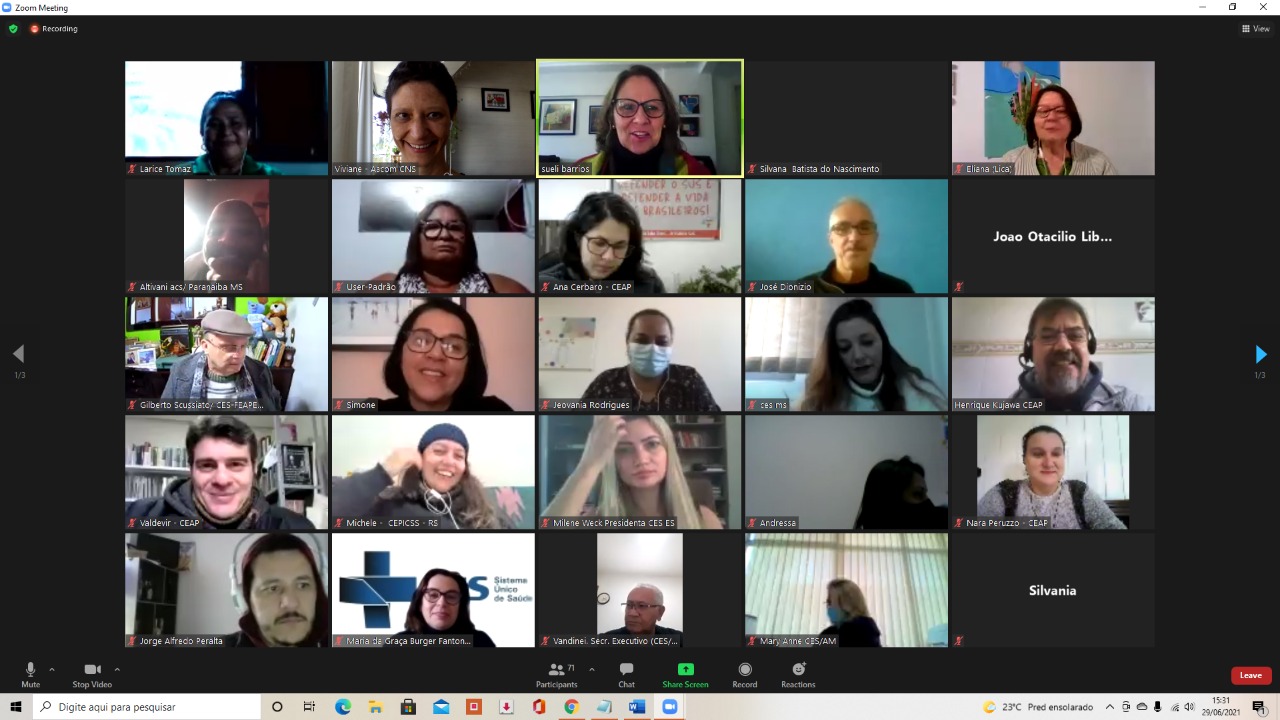 A Comissão Intersetorial de Educação Permanente para o Controle Social do SUS (CIEPCSS), do Conselho Nacional de Saúde (CNS), e o Centro de Assessoramento em Educação Popular (Ceap) reuniram-se nesta terça-feira (29/06) com as coordenações das comissões de educação permanente, representantes da Mesa Diretora e Secretaria Executiva dos Conselhos Estaduais de Saúde (CES) e do Distrito Federal.