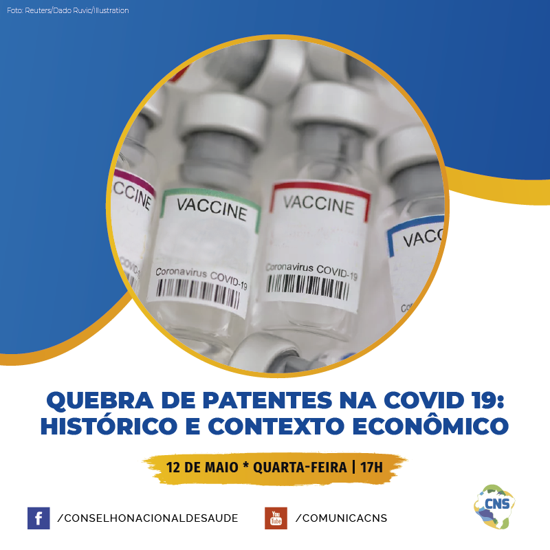 O Conselho Nacional de Saúde (CNS) vai discutir a quebra de patentes para vacinas, medicamentos e demais tecnologias utilizadas para combater e tratar a Covid-19. O assunto será tema da live, na quarta-feira (12/05), às 17h, com transmissão pelo Facebook e Youtube do CNS.