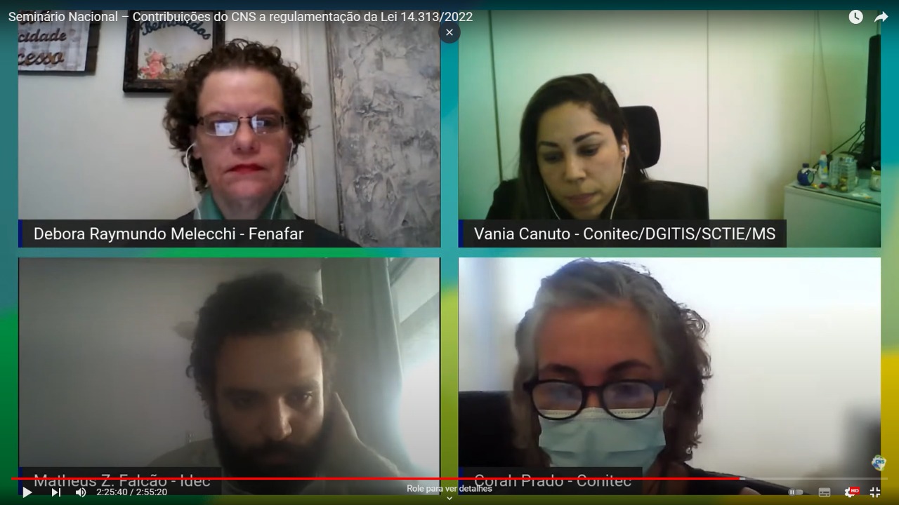 O seminário foi promovido pela Comissão Intersetorial de Ciência, Tecnologia e Assistência Farmacêutica (Cictaf) do CNS e contou com a participação de representantes da Anvisa, Conitec, Ministério da Saúde, Biored Brasil e do Instituto Brasileiro de Defesa do Consumidor (Idec). O objetivo foi construir um posicionamento do Controle Social sobre o tema.