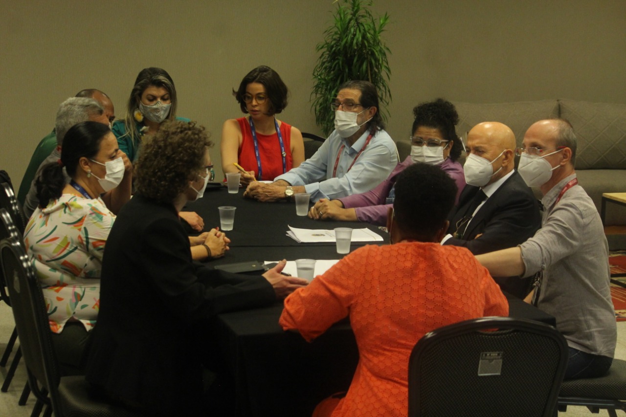 Ainda na sexta (18/11), conselheiros nacionais de saúde reuniram-se com o senador Confúcio Moura, que é relator do orçamento da Saúde para 2023. Além de Pigatto, participaram do encontro os representantes da mesa diretora Ana Lúcia Paduello, Conceição Silva e Neilton Araújo, o coordenador adjunto da Comissão Intersetorial de Orçamento e Finanças (Cofin), Mauri Bezerra e representantes dos fóruns dos trabalhadores em saúde Débora Melecchi e Ruth Guilherme e do fórum dos usuários Jacildo Siqueira Pinho.