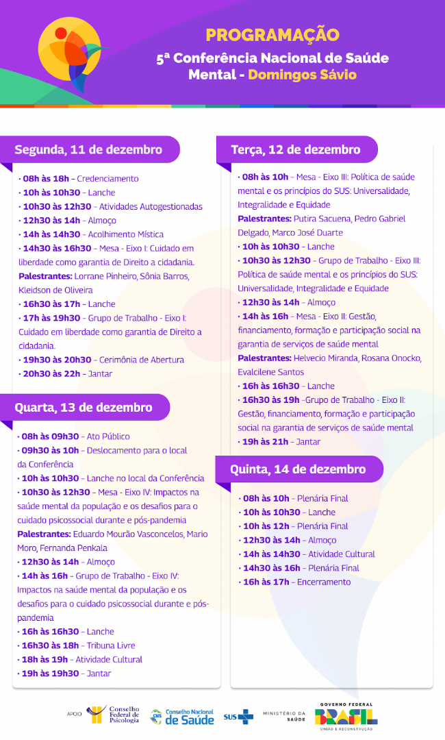 Com o tema “A política de Saúde Mental como Direito: pela defesa do cuidado em liberdade, rumo a avanços e garantia dos serviços de atenção psicossocial no SUS”, a 5ª Conferência Nacional de Saúde Mental (CNSM) Domingos Sávio, será realizada de 11 a 14 de dezembro, no Centro Internacional de Convenções do Brasil (CICB), em Brasília (DF). Os dois primeiros dias do encontro, incluindo a mesa de abertura, prevista para às 19h30, do dia 11/12, contarão com transmissão ao vivo.