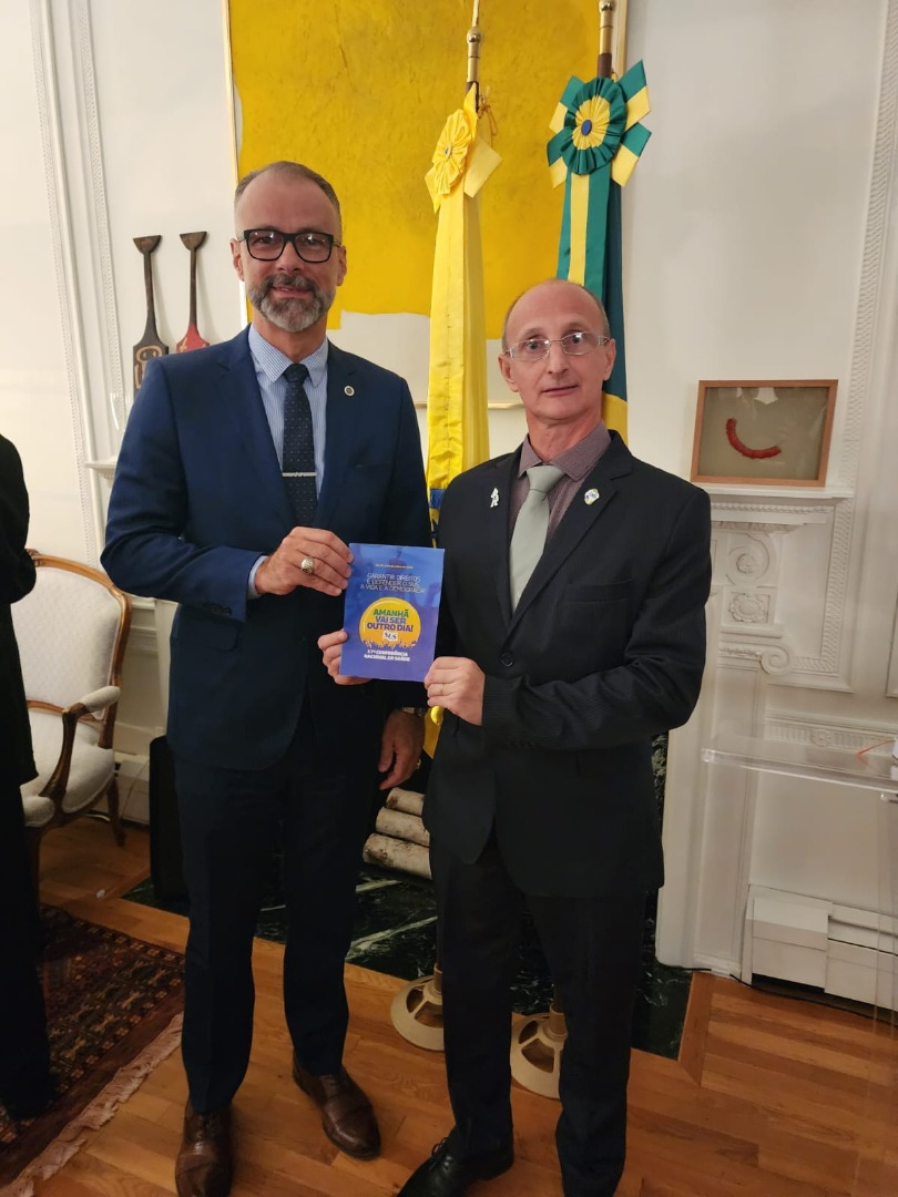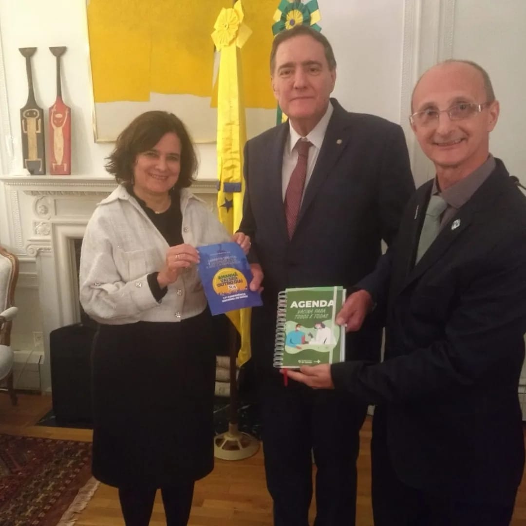 O presidente do CNS, Fernando Pigatto, entregou a Jarbas Barbosa e à Ministra da Saúde, Nísia Trindade, a agenda do Conselho Nacional de Saúde e a cartilha da 17ª Conferência Nacional de Saúde, que será realizada de 2 a 5 de julho de 2023.