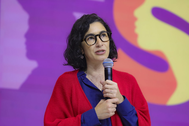 Descrição da imagem: Altamira em pé com microfone na mão, ao fundo tela com logomarca da conferência.