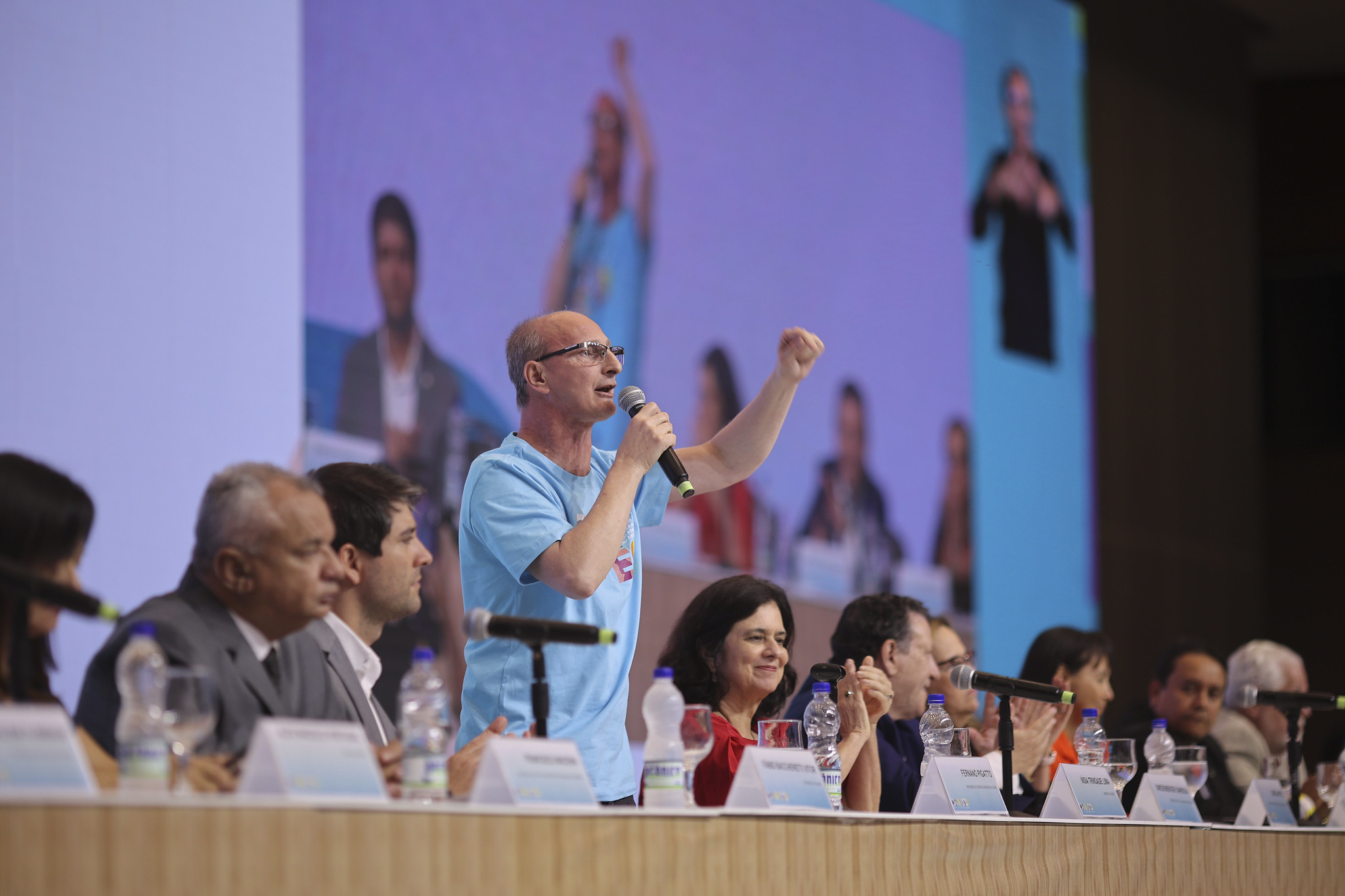 Descrição da imagem: Mesa de abertura com todos os convidados sentados e Fernando Pigatto em pé, com microfone na mão. Ao fundo, logomarca da conferência