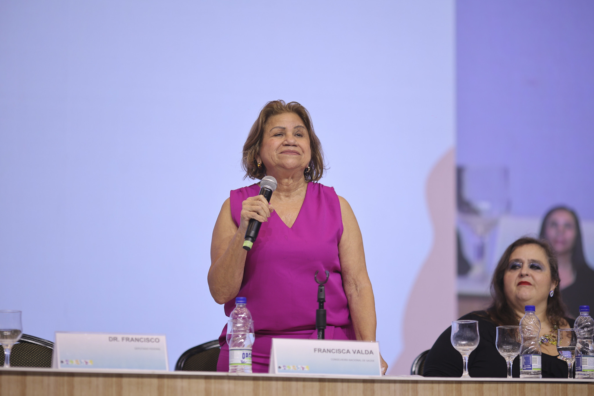 Descrição da imagem: Francisca Valda em pé, com microfone na mão. Ao lado direito Fernanda Magano sentada na mesa de abertura.