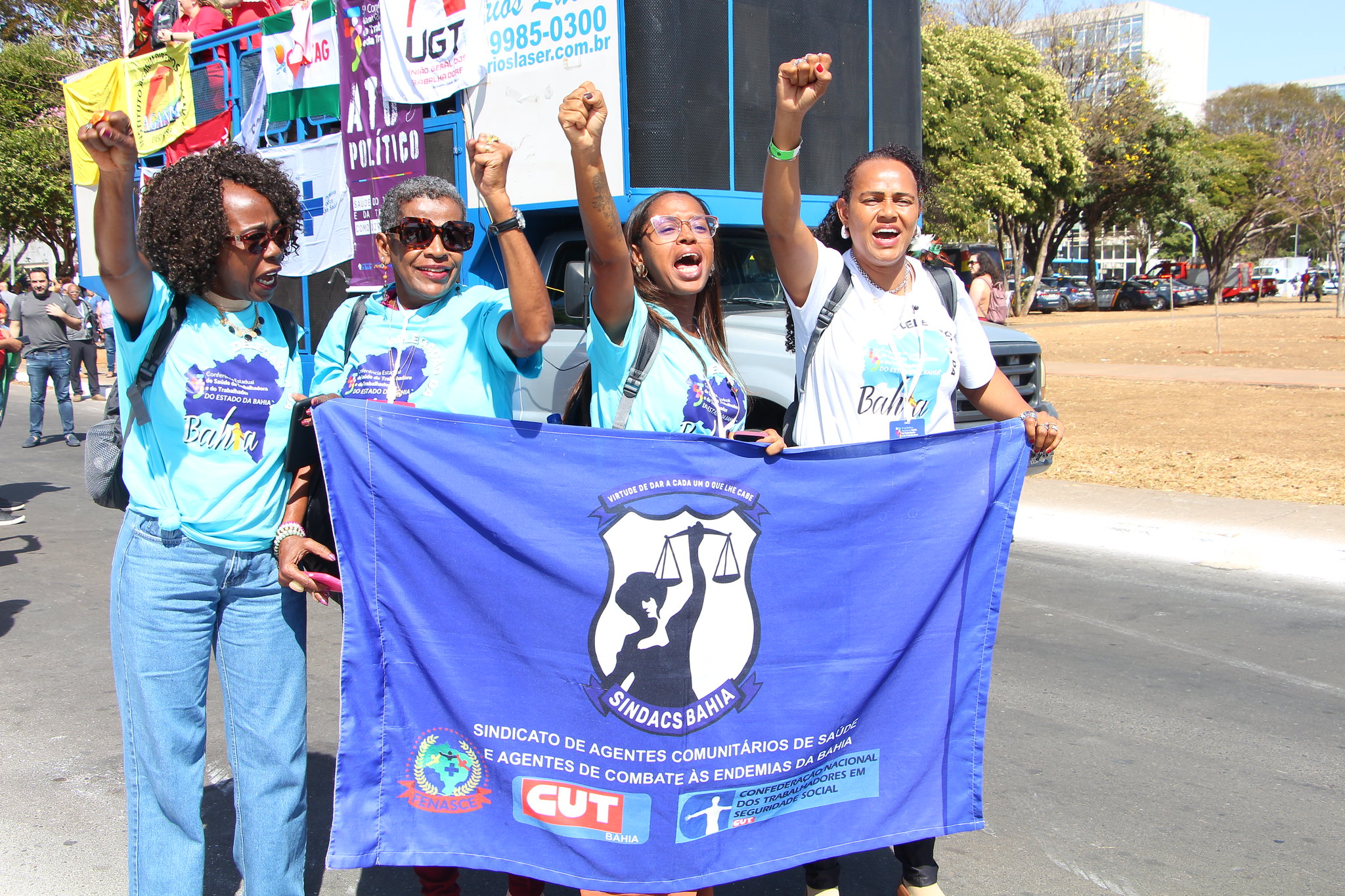 - Quatro mulheres vestindo azul seguram uma bandeira do Sindicato dos Agentes Comunitarios durante o ato público. Elas estão na rua, com mãos em punho, na frente do carro de som