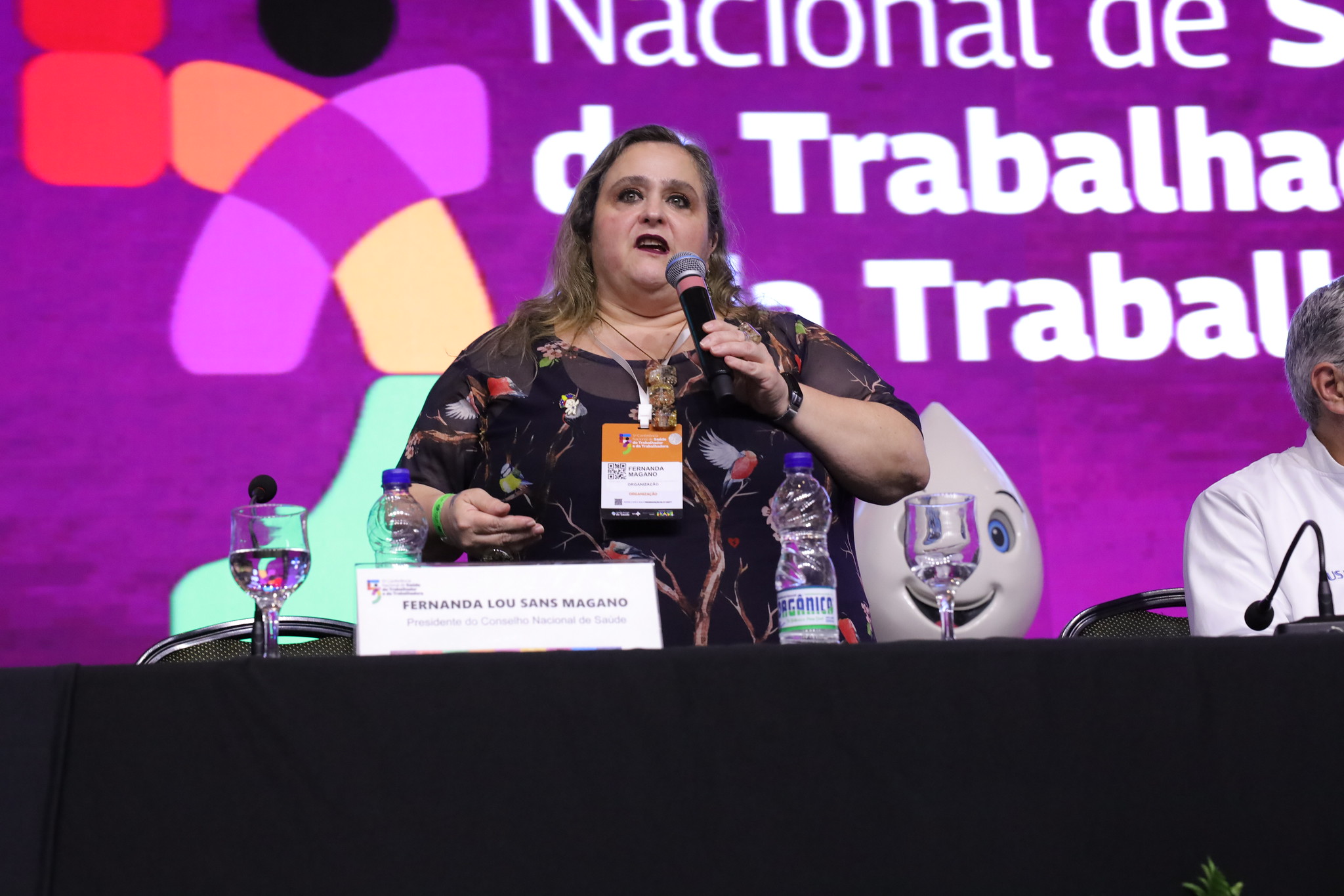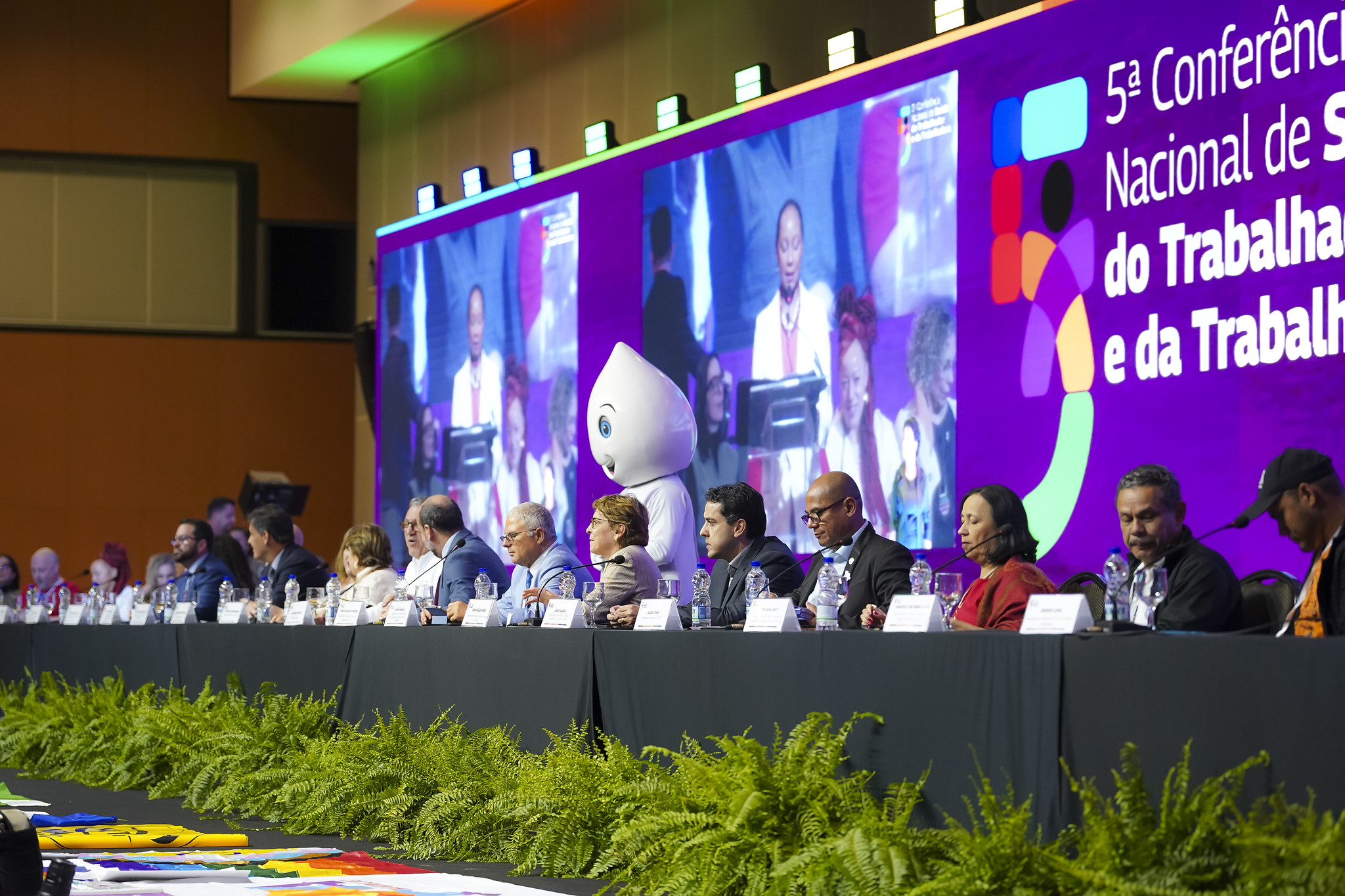 - Foto em diagonal da mesa de abertura, com vinte pessoas sentadas. Ao fundo, telão em led na cor roxa com a logomarca da conferência. Entre as pessoas sentadas e o telão o Zé Gotinha em pé.