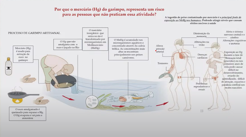 "O excedente de mercúrio despejado no rio não se mistura na água, pois sua densidade é 13 vezes maior. Em vez disso, ele se deposita no fundo do leito, onde bactérias o transformam em metilmercúrio, uma forma orgânica que entra na cadeia alimentar, contaminando peixes, algas, crustáceos e outros animais aquáticos. Quando os humanos consomem esses peixes, acabam ingerindo o mercúrio, tornando o pescado o principal veículo de contaminação, enfatizou Paulo Cesar Basta.