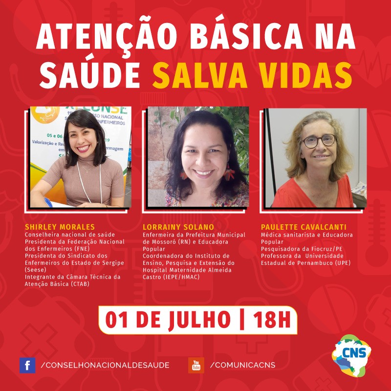 A atividade ocorre no âmbito da reunião aberta e ampliada do Comitê para Enfrentamento à Covid-19 do CNS e é a 7ª edição transmitida ao vivo. Para falar sobre o tema, foram convidadas a enfermeira da prefeitura de Mossoró (RN), educadora popular e coordenadora do Instituto de Ensino, Pesquisa e Extensão do Hospital Maternidade Almeida Castro (Iepe/HMAC), Lorrainy Solano; e a médica sanitarista, educadora popular, pesquisadora da Fundação Oswaldo Cruz (Fiocruz/PE) e professora da Universidade Estadual de Pernambuco (UPE), Paulette Cavalcanti. O encontro será mediado pela conselheira nacional de Saúde pela Federação Nacional dos Enfermeiros (FNE), integrante da Câmara Técnica da Atenção Básica (CTAB) e presidenta do Sindicato dos Enfermeiros do Estado de Sergipe (Seese), Shirley Morales.